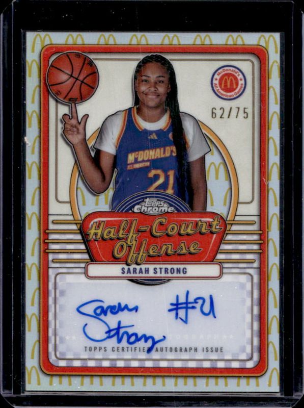 The Sarah Strong 2024 Topps Chrome McDonald's All-American #IML-SAR Half-Court Signatures - McDonald's Logo Refractor /75 card is 1 of 112 Sarah Strong's card variations in the 2024 Topps Chrome McDonald's All-American set being tracked by Sports Card Investor, including #60 Base, #10 Base, #10 Blue RayWave Refractor, #60 Blue RayWave Refractor, and #10 McDonald's Logo Refractor.