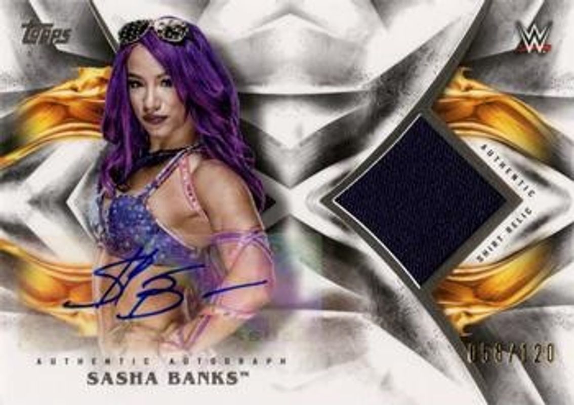 The Sasha Banks 2019 Topps WWE Undisputed #UAR-SB Undisputed Auto Relic /120 card is 1 of 24 Sasha Banks' card variations in the 2019 Topps WWE Undisputed set being tracked by Sports Card Investor, including Base, Orange /99, Green /50, Blue /25, and Gold /10.