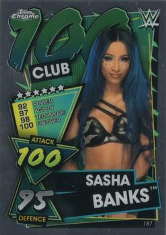 The Sasha Banks 2021 Topps Chrome Slam Attax WWE #187 Base card is 1 of 31 Sasha Banks' card variations in the 2021 Topps Chrome Slam Attax WWE set being tracked by Sports Card Investor, including #146 Base, #93 Base, #146 Refractor, #187 Refractor, and #93 Refractor.