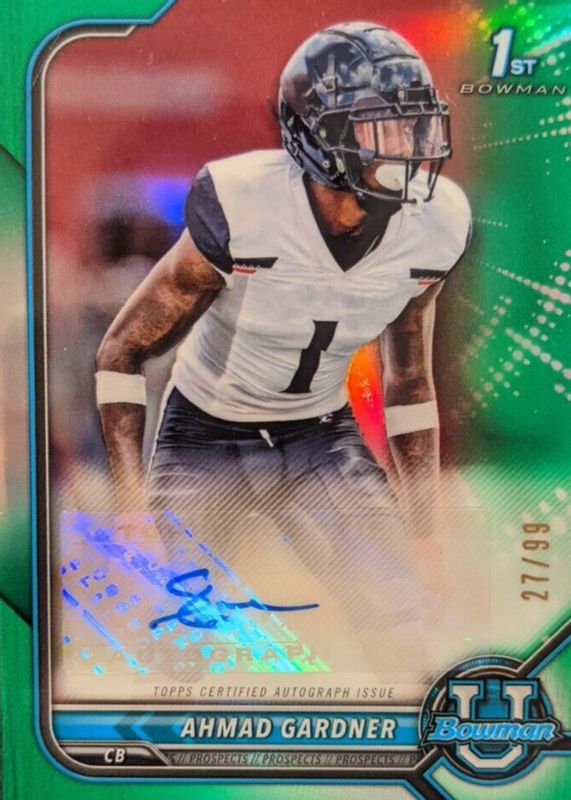 The Sauce Gardner 2021 Bowman University #BCPA-AG Chrome Prospect Auto - Green Refractor /99 (1st) card in Raw condition has not changed in price in the last 30 days and was last sold for $28.00 .