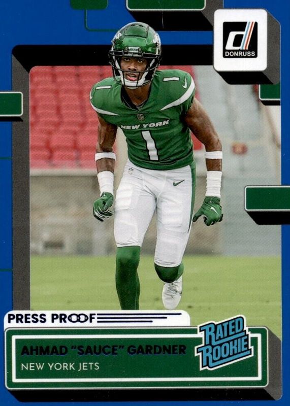 2022 Panini Donruss Rated Rookie Press Proof Blue Ahmad Sauce Gardner Jets #328