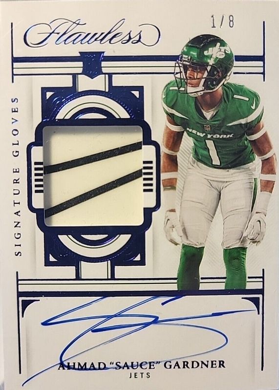 The Sauce Gardner 2022 Flawless #SG-AG Signature Gloves - Sapphire /8 Rookie card in Raw condition has not changed in price in the last 30 days and was last sold for $85.56 .