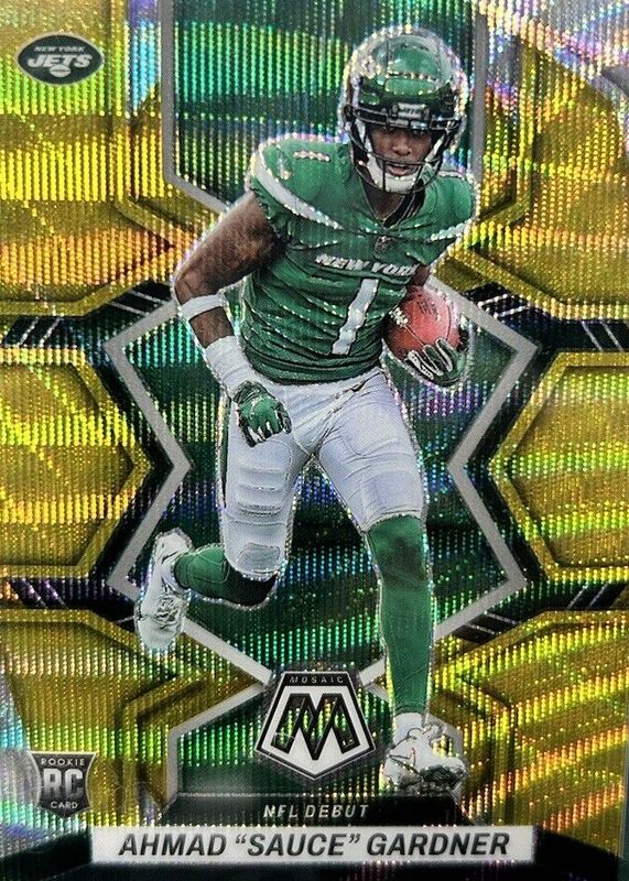The Sauce Gardner 2022 Mosaic #289 NFL Debut - Gold Wave /17 Rookie card in Raw condition has not changed in price in the last 30 days and was last sold for $26.00 .