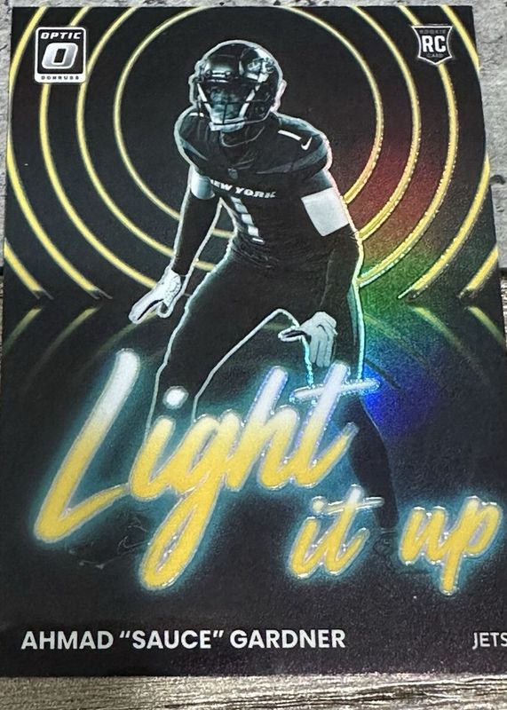 The Sauce Gardner 2022 Optic #LU-19 Light It Up - Gold /10 Rookie card in Raw condition has not changed in price in the last 30 days and was last sold for $49.00 .