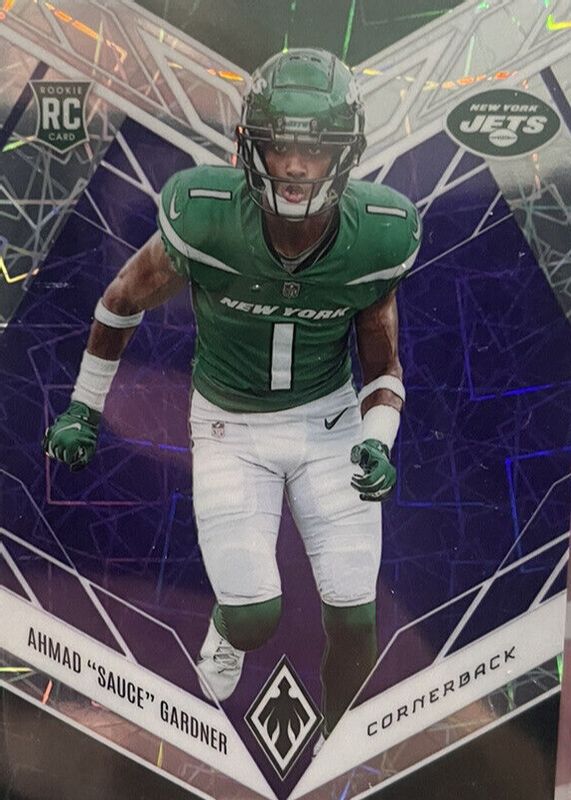 2022 Panini Phoenix Purple Lazer #128 Ahmad Sauce Gardner RC Rookie 47/99 JETS