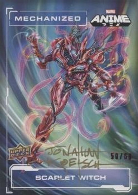 The Scarlet Witch 2020 Upper Deck Marvel Anime #M-10 Mechanized Artist Auto /60 card is 1 of 11 Scarlet Witch's card variations in the 2020 Upper Deck Marvel Anime set being tracked by Sports Card Investor, including Base, Color Spiral, Hyper Mosaic, Japanese Mega Moon, and Red Foil Artist Auto /120.
