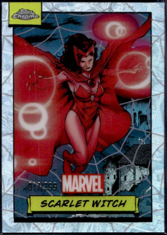 The Scarlet Witch 2024 Topps Chrome #112 Spiderweb Refractor /399 card is 1 of 29 Scarlet Witch's card variations in the 2024 Topps Chrome set being tracked by Sports Card Investor, including Base, Refractor, Blue Wave Refractor /150, Green Gamma Ray Wave Refractor /99, and Green Refractor /99.