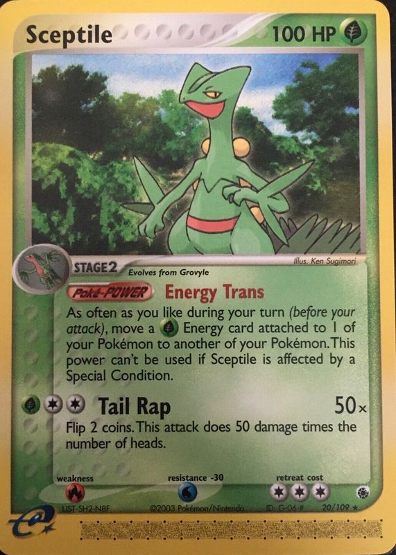 The Sceptile 2003 EX: Ruby & Sapphire #020/109 Base card in Raw TCG (Near Mint) condition has not changed in price in the last 30 days and was last sold for $5.60 .