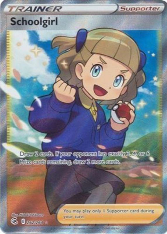 The Schoolgirl 2021 Sword & Shield: Fusion Strike #262/264 Holo (Full Art) card in Raw TCG (Near Mint) condition has moved up $0.45 (+17.6%) in the last 30 days and was last sold for $3.00 .