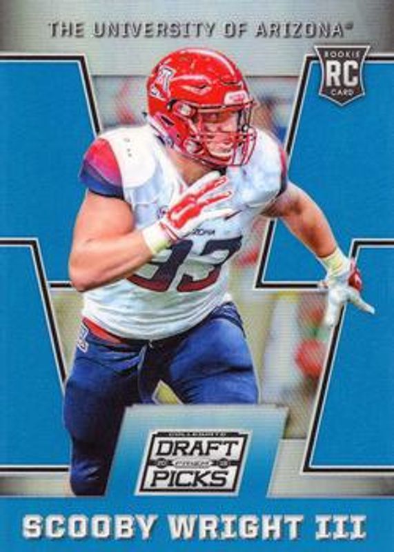 The Scooby Wright 2016 Prizm Draft Picks #224 Blue card is 1 of 23 Scooby Wright's card variations in the 2016 Prizm Draft Picks set being tracked by Sports Card Investor, including Red, Camo /199, Purple /99, Tie Dyed /49, and Red White & Blue /25.