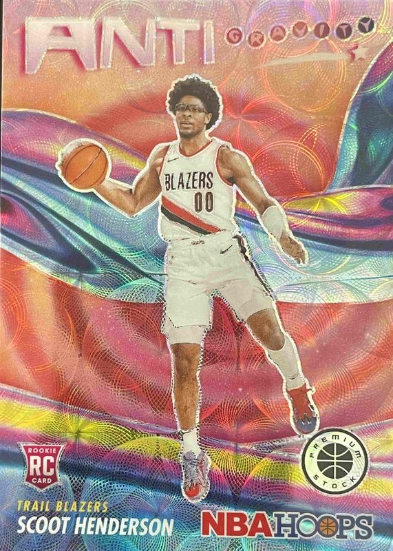 The Scoot Henderson 2023 Hoops Premium Stock #9 Anti Gravity - Premium Red /88 Rookie card in Raw condition has not changed in price in the last 30 days and was last sold for $2.00 .