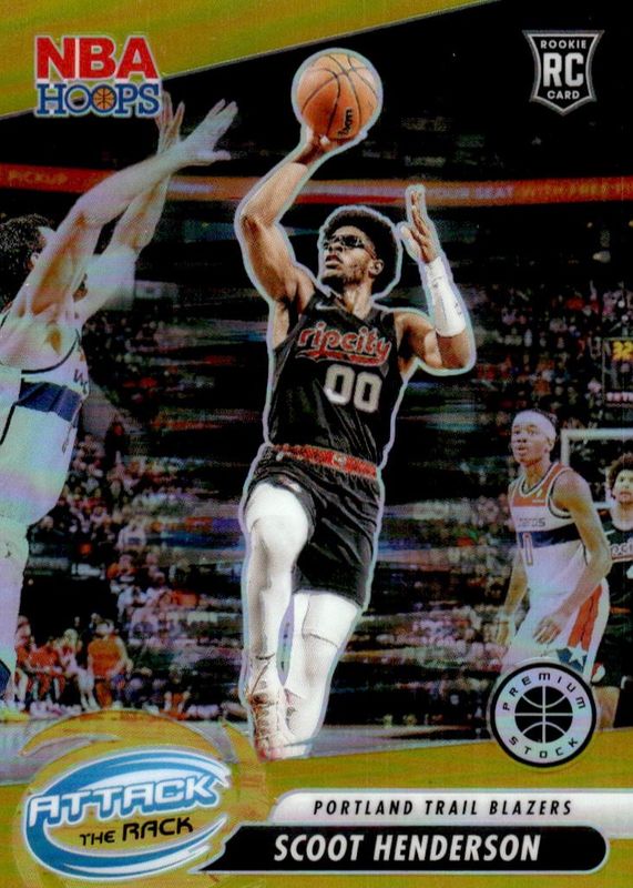 The Scoot Henderson 2023 Hoops Premium Stock #6 Attack the Rack - Gold /10 Rookie card in Raw condition has not changed in price in the last 30 days and was last sold for $5.75 .
