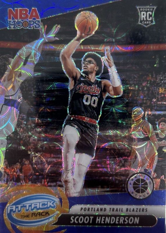 The Scoot Henderson 2023 Hoops Premium Stock #6 Attack the Rack - Premium Blue /25 Rookie card in Raw condition has not changed in price in the last 30 days and was last sold for $13.49 .