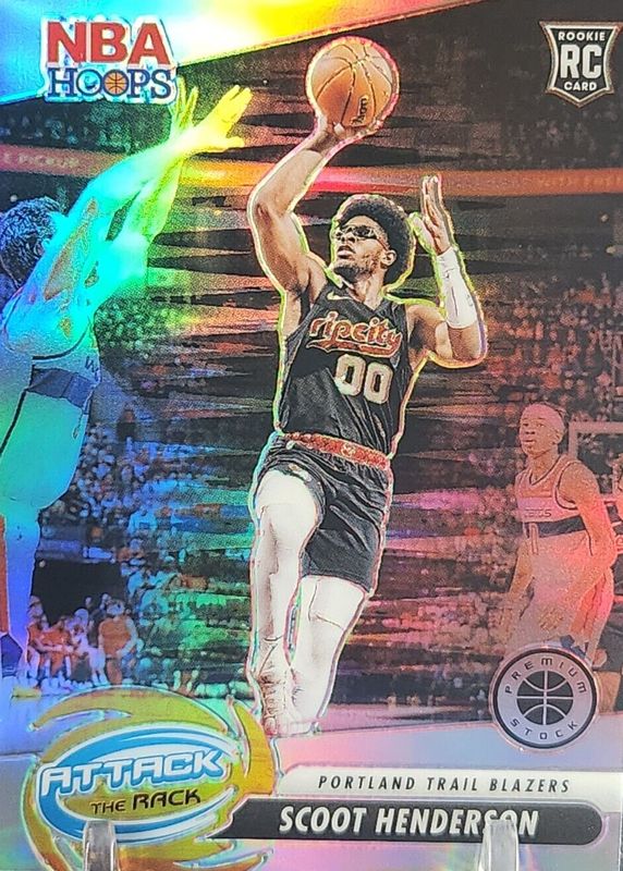 The Scoot Henderson 2023 Hoops Premium Stock #6 Attack the Rack - Silver Rookie card in Raw condition has not changed in price in the last 30 days and was last sold for $1.13 .