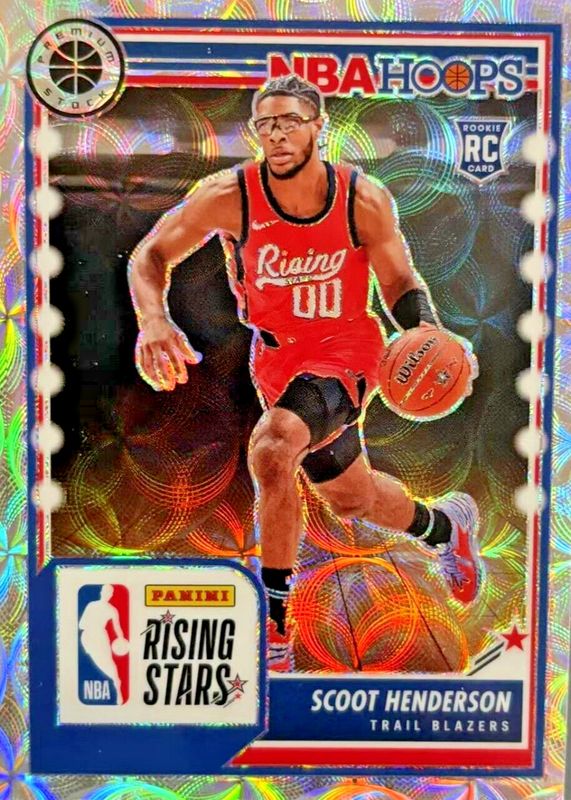 The Scoot Henderson 2023 Hoops Premium Stock #280 Rising Stars - Premium Rookie card in Raw condition has not changed in price in the last 30 days and was last sold for $0.99 .