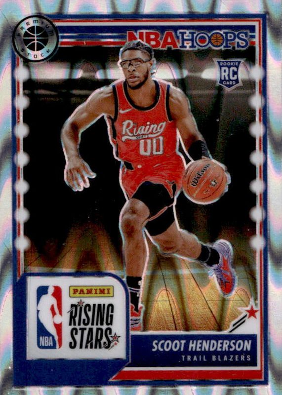 The Scoot Henderson 2023 Hoops Premium Stock #280 Rising Stars - Seismic Rookie card in Raw condition has not changed in price in the last 30 days and was last sold for $3.25 .