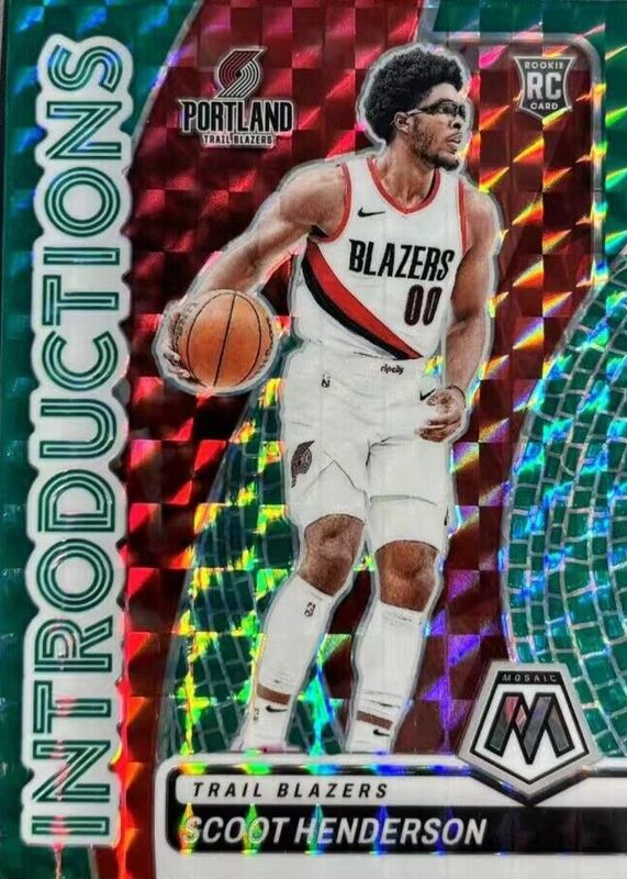 The Scoot Henderson 2023 Mosaic #18 Introductions - Teal /75 Rookie card in Raw condition has not changed in price in the last 30 days and was last sold for $5.50 .