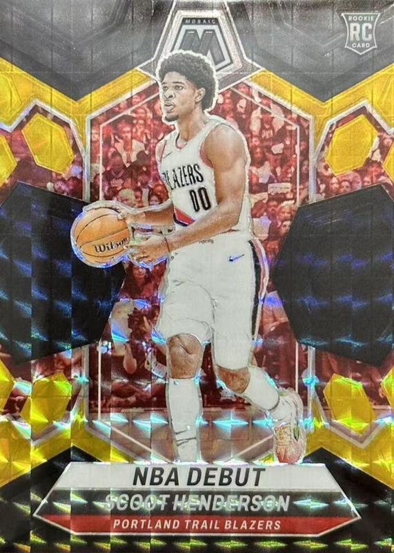 The Scoot Henderson 2023 Mosaic #255 NBA Debut - Choice Black Gold /8 Rookie card in Raw condition has not changed in price in the last 30 days and was last sold for $130.50 .
