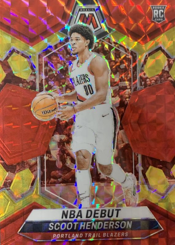 The Scoot Henderson 2023 Mosaic #255 NBA Debut - Choice Fusion Red & Yellow /75 Rookie card in Raw condition has not changed in price in the last 30 days and was last sold for $5.50 .