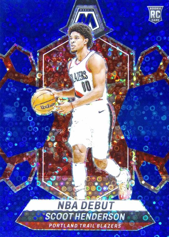 The Scoot Henderson 2023 Mosaic #255 NBA Debut - Fast Break Blue /85 Rookie card in Raw condition has not changed in price in the last 30 days and was last sold for $7.19 .