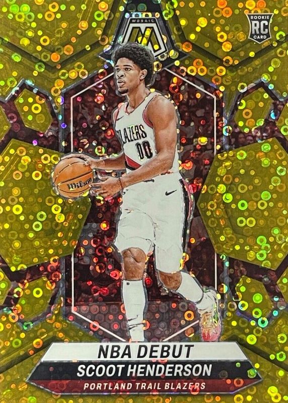 The Scoot Henderson 2023 Mosaic #255 NBA Debut - Fast Break Gold /10 Rookie card in Raw condition has not changed in price in the last 30 days and was last sold for $156.50 .