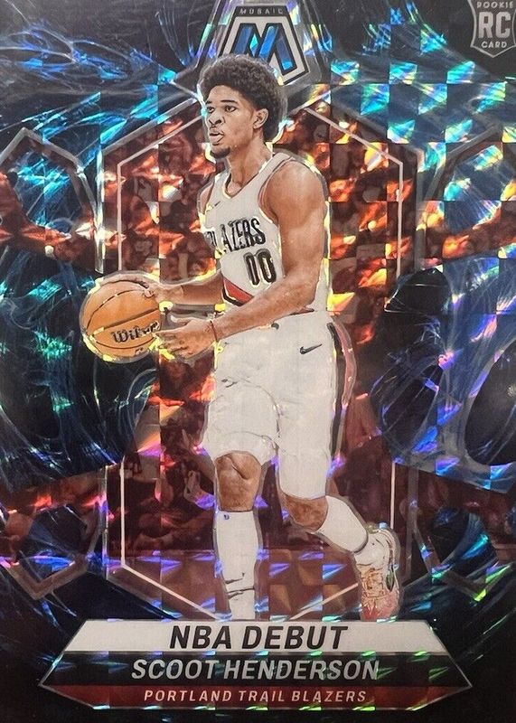The Scoot Henderson 2023 Mosaic #255 NBA Debut - Genesis /(SSP) Rookie card in Raw condition has not changed in price in the last 30 days and was last sold for $60.00 .