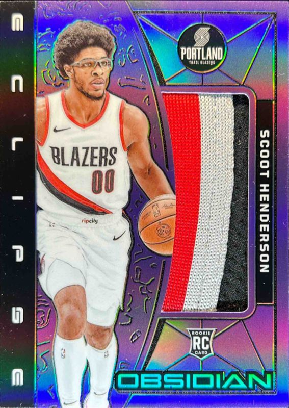 The Scoot Henderson 2023 Obsidian #EM-SCO Eclipse Materials - Purple Flood /49 Rookie card is 1 of 86 Scoot Henderson's card variations in the 2023 Obsidian set being tracked by Sports Card Investor, including Base, Electric Etch International, Electric Etch Neon Flood, Electric Etch Pink Pulsar, and Electric Etch Red Flood.