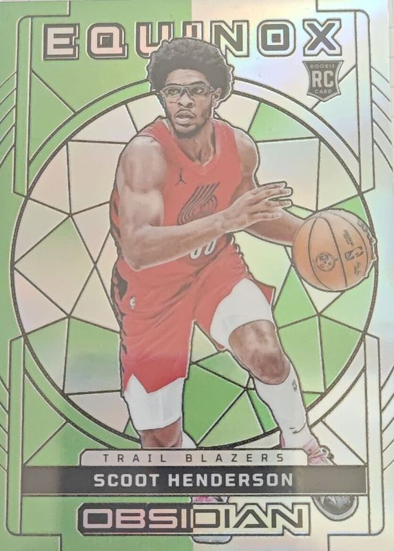 The Scoot Henderson 2023 Obsidian #18 Equinox - Electric Etch Green Flood /25 Rookie card in Raw condition has not changed in price in the last 30 days and was last sold for $23.50 .