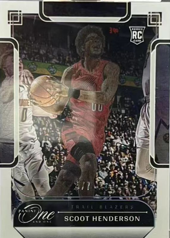 This card is 1 of 9 Scoot Henderson's card variations in the 2023 One and One set being tracked by Sports Card Investor, including Base /99, Blue /35, Purple /25, Red /15, and Gold /10.
