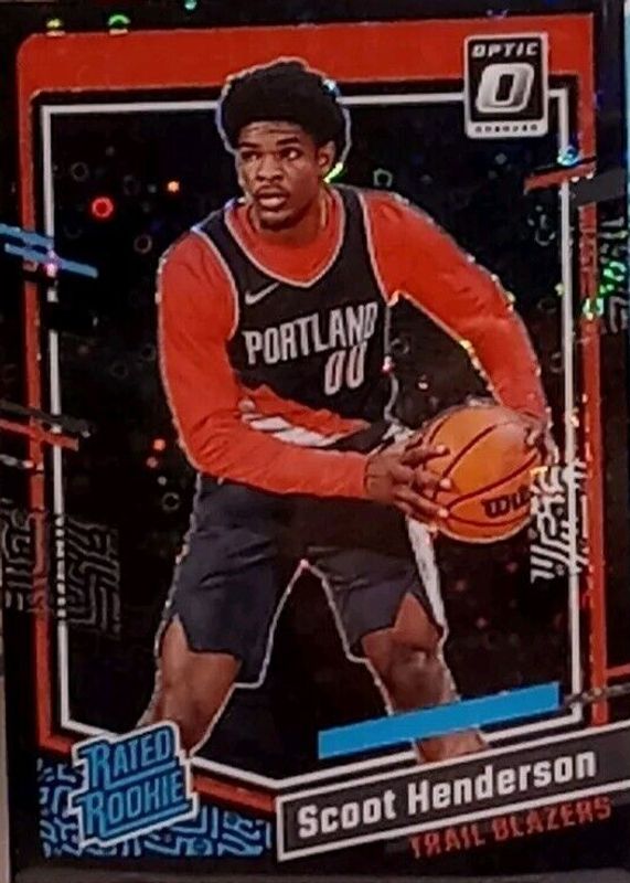 This card is 1 of 159 Scoot Henderson's card variations in the 2023 Optic set being tracked by Sports Card Investor, including Base, Blue Velocity, Checkerboard, Choice Red & Green, and Fast Break.