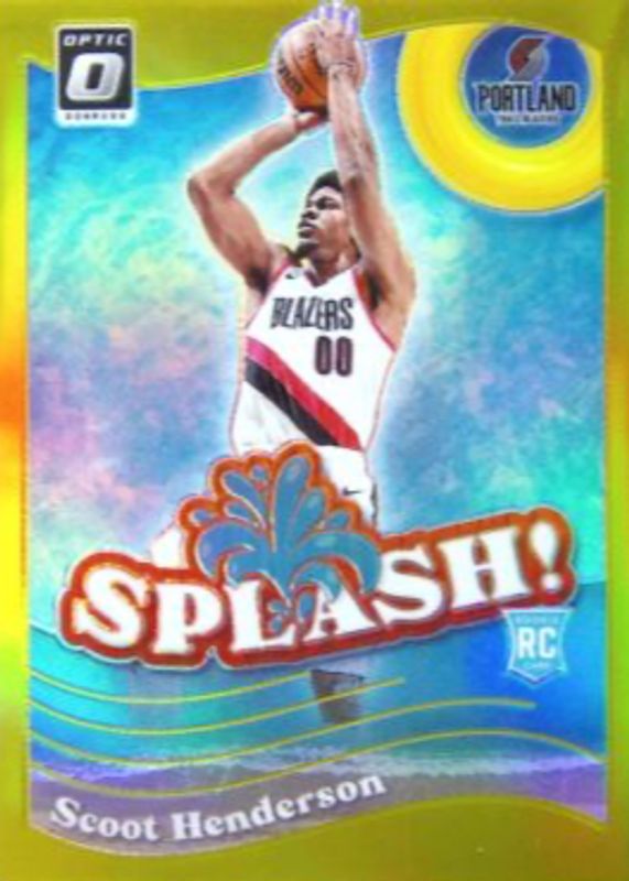 The Scoot Henderson 2023 Optic #15 Splash! - Gold /10 Rookie card in Raw condition has not changed in price in the last 30 days and was last sold for $67.00 .
