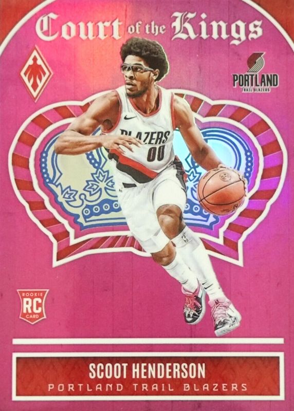The Scoot Henderson 2023 Phoenix #13 Court of the Kings - Pink /99 Rookie card in Raw condition has moved down -$4.99 (-47.6%) in the last 30 days and was last sold for $5.50 .