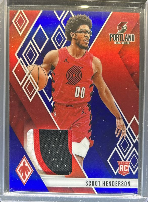 The Scoot Henderson 2023 Phoenix #RM-SCT Rookie Memorabilia - Blue /25 card is 1 of 190 Scoot Henderson's card variations in the 2023 Phoenix set being tracked by Sports Card Investor, including Base, Blue Ice, Color Burst, Dream Weaver, and Hieroglyphs.