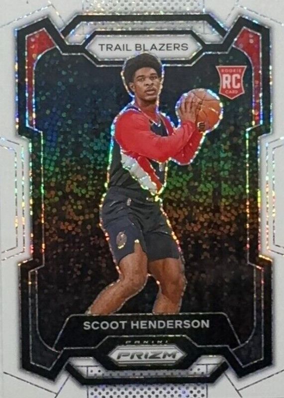 This card is 1 of 82 Scoot Henderson's card variations in the 2023 Prizm set being tracked by Sports Card Investor, including Base, Blue Wave, Choice Blue Yellow Green, Fast Break, and Green.