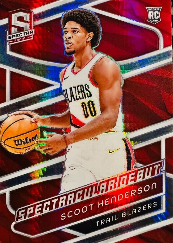 Auctions Ending Soon for Scoot Henderson 2023 Spectra #187 Spectacular Debut - International Red Rookie RAW