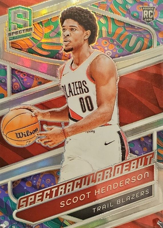 The Scoot Henderson 2023 Spectra #187 Spectacular Debut - Psychedelic Rookie card in Raw condition has not changed in price in the last 30 days and was last sold for $26.36 .
