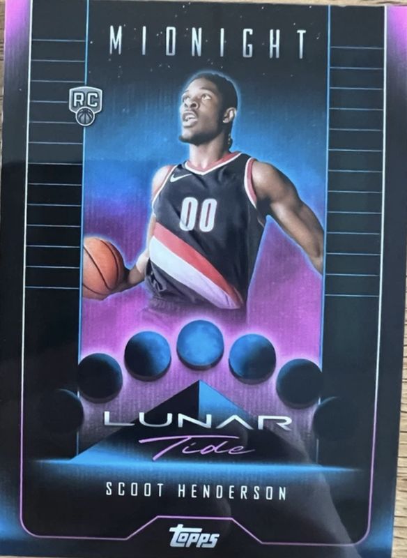 The Scoot Henderson 2023 Topps Midnight #LT-13 Lunar Tide Rookie card is 1 of 54 Scoot Henderson's card variations in the 2023 Topps Midnight set being tracked by Sports Card Investor, including Base, Moon Beam, Zodiac, Morning /149, and Twilight /99.