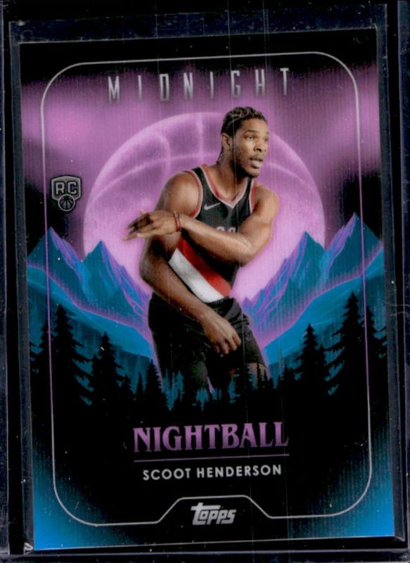 The Scoot Henderson 2023 Topps Midnight #NB-23 Nightball Rookie card is 1 of 54 Scoot Henderson's card variations in the 2023 Topps Midnight set being tracked by Sports Card Investor, including Base, Moon Beam, Zodiac, Morning /149, and Twilight /99.