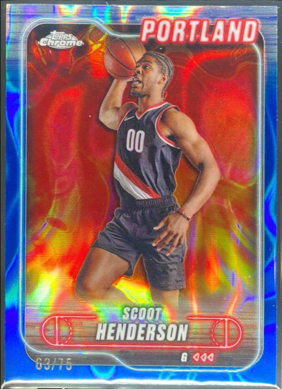 The Scoot Henderson 2024 Topps Chrome #24 Blue Lava Refractor /75 card is 1 of 60 Scoot Henderson's card variations in the 2024 Topps Chrome set being tracked by Sports Card Investor, including Base, Blue Basketball Refractor, Magenta Refractor, Negative Refractor, and Pink Basketball Refractor.
