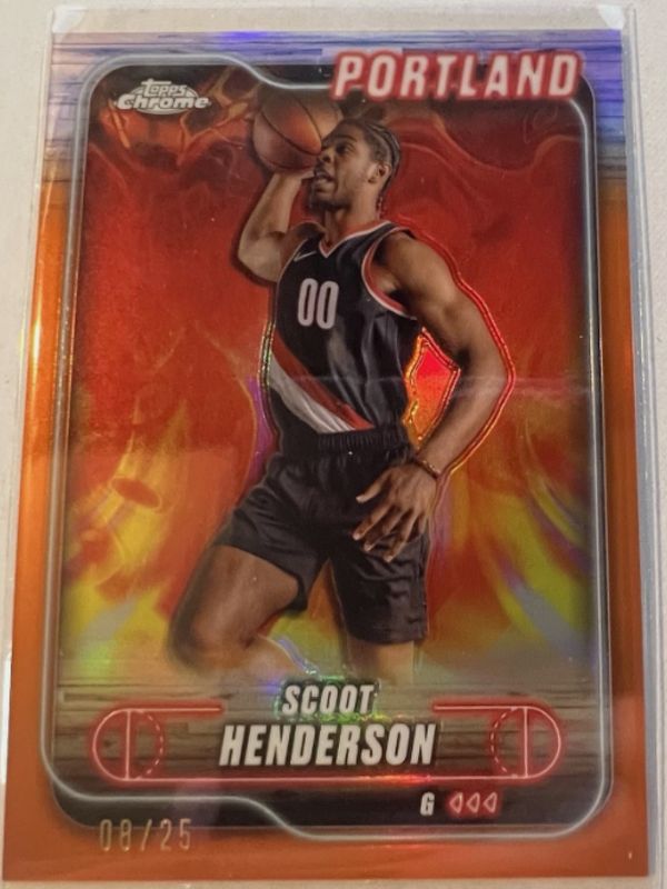 The Scoot Henderson 2024 Topps Chrome #24 Orange Refractor /25 card is 1 of 60 Scoot Henderson's card variations in the 2024 Topps Chrome set being tracked by Sports Card Investor, including Base, Blue Basketball Refractor, Magenta Refractor, Negative Refractor, and Pink Basketball Refractor.