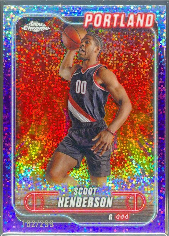 The Scoot Henderson 2024 Topps Chrome #24 Purple Speckle Refractor /299 card is 1 of 60 Scoot Henderson's card variations in the 2024 Topps Chrome set being tracked by Sports Card Investor, including Base, Blue Basketball Refractor, Magenta Refractor, Negative Refractor, and Pink Basketball Refractor.