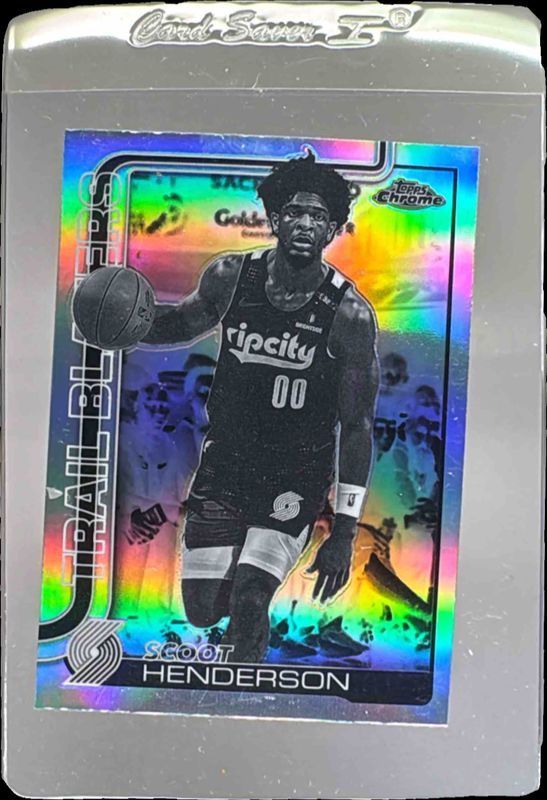 The Scoot Henderson 2025 Topps Chrome #166 Negative Refractor card is 1 of 88 Scoot Henderson's card variations in the 2025 Topps Chrome set being tracked by Sports Card Investor, including Base, 1st Day Issue Refractor, Basketball Refractor, Box Set Refractor, and Lightboard Logo Refractor.
