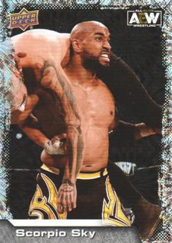 The Scorpio Sky 2022 Upper Deck AEW #26 Pyro card is 1 of 25 Scorpio Sky's card variations in the 2022 Upper Deck AEW set being tracked by Sports Card Investor, including Base, Gold, Silver Foil, Green Pyro /399, and Dynamite /299.
