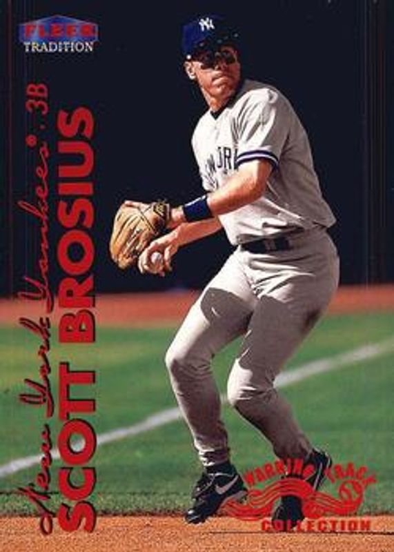 The Scott Brosius 1999 Fleer Tradition #112W Warning Track Collection card is 1 of 4 Scott Brosius' card variations in the 1999 Fleer Tradition set being tracked by Sports Card Investor, including Base, Millennium, and Starting 9 /9.