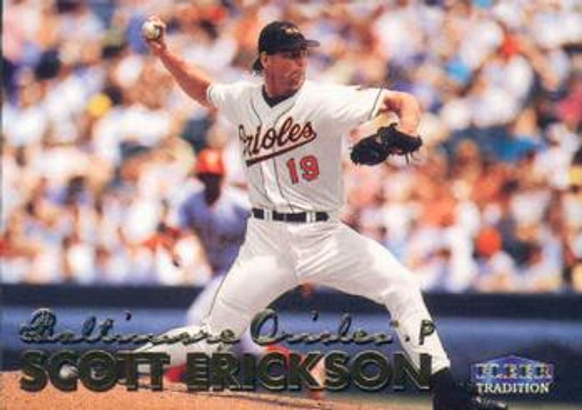 The Scott Erickson 1999 Fleer Tradition #296 Base card is 1 of 4 Scott Erickson's card variations in the 1999 Fleer Tradition set being tracked by Sports Card Investor, including Millennium, Warning Track Collection, and Starting 9 /9.