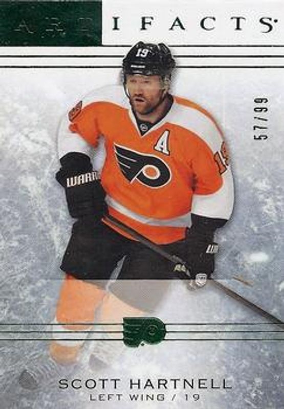 The Scott Hartnell 2014 Upper Deck Artifacts #84 Emerald /99 card is 1 of 12 Scott Hartnell's card variations in the 2014 Upper Deck Artifacts set being tracked by Sports Card Investor, including Base /999, Ruby /499, Sapphire /85, Gold Spectrum /25, and Black /5.