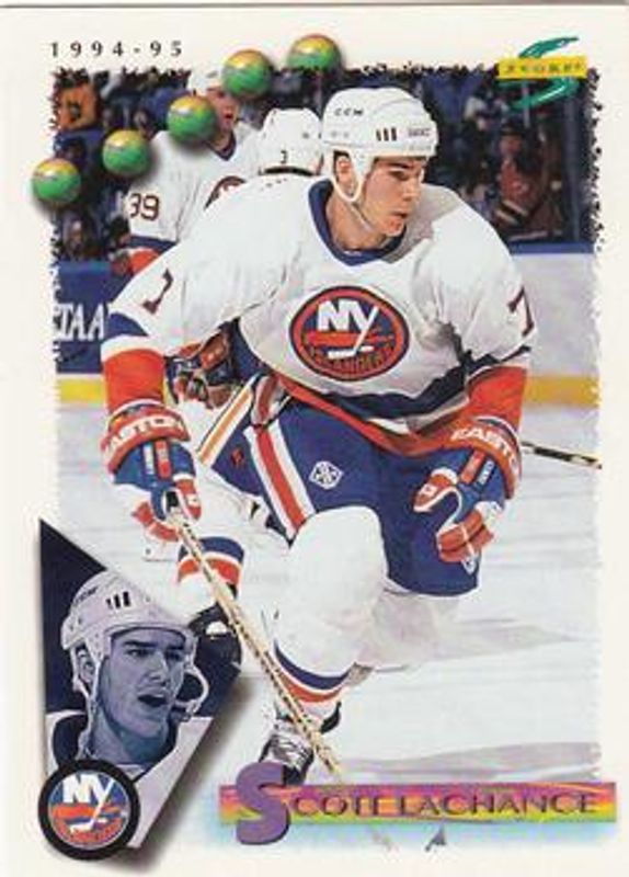 The Scott Lachance 1994 Score #195 Base card is 1 of 4 Scott Lachance's card variations in the 1994 Score set being tracked by Sports Card Investor, including Gold Line, Gold Line - Punched, and Platinum.