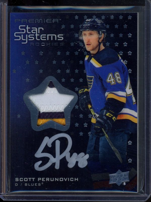 The Scott Perunovich 2021 Upper Deck Premier #SSR-PE Star Systems Rookies - Auto Patch /149 card is 1 of 34 Scott Perunovich's card variations in the 2021 Upper Deck Premier set being tracked by Sports Card Investor, including Base /399, Gold /199, Bronze /65, Purple /10, and Platinum /1.
