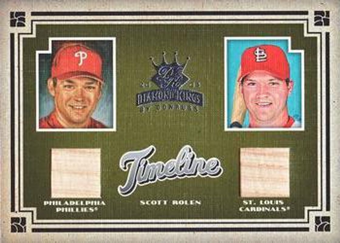 The Scott Rolen 2005 Diamond Kings #T-15 Timeline Materials Bat /25 card is 1 of 222 Scott Rolen's card variations in the 2005 Diamond Kings set being tracked by Sports Card Investor, including #419 Base, #210 Base, #398 Base, #210 Black & White, and #419 Framed Red.