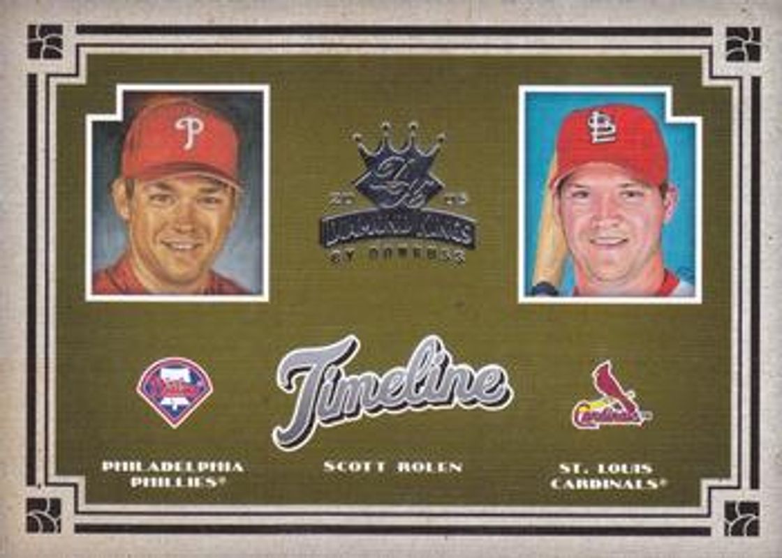 The Scott Rolen 2005 Diamond Kings #T-15 Timeline card is 1 of 222 Scott Rolen's card variations in the 2005 Diamond Kings set being tracked by Sports Card Investor, including #419 Base, #210 Base, #398 Base, #210 Black & White, and #419 Framed Red.